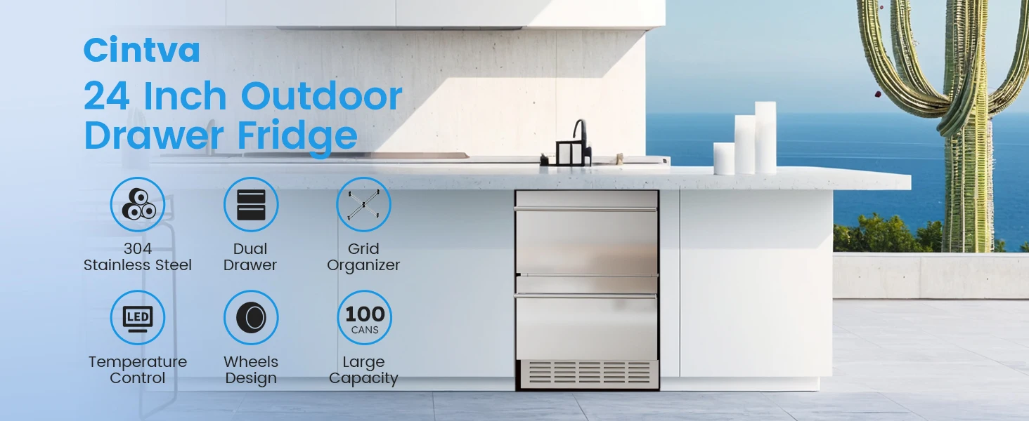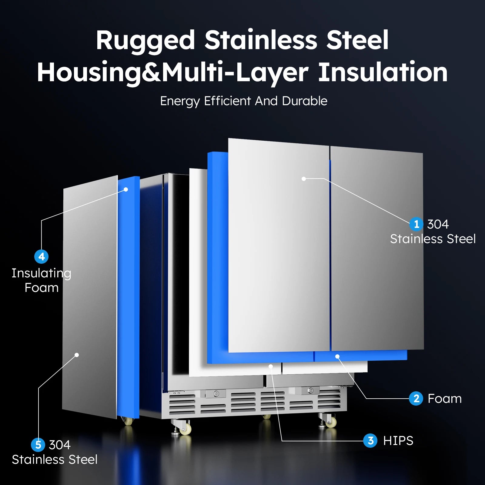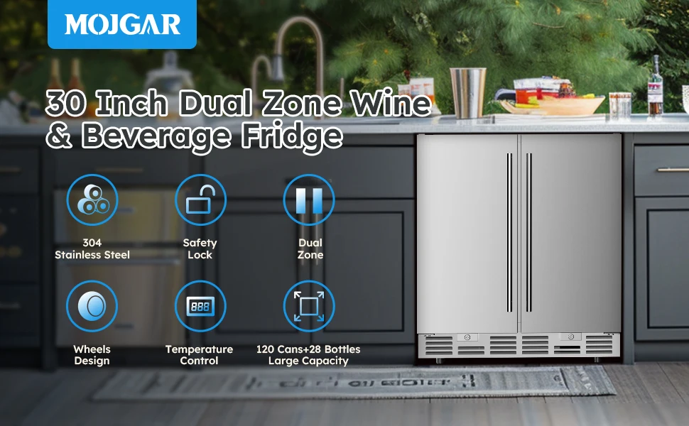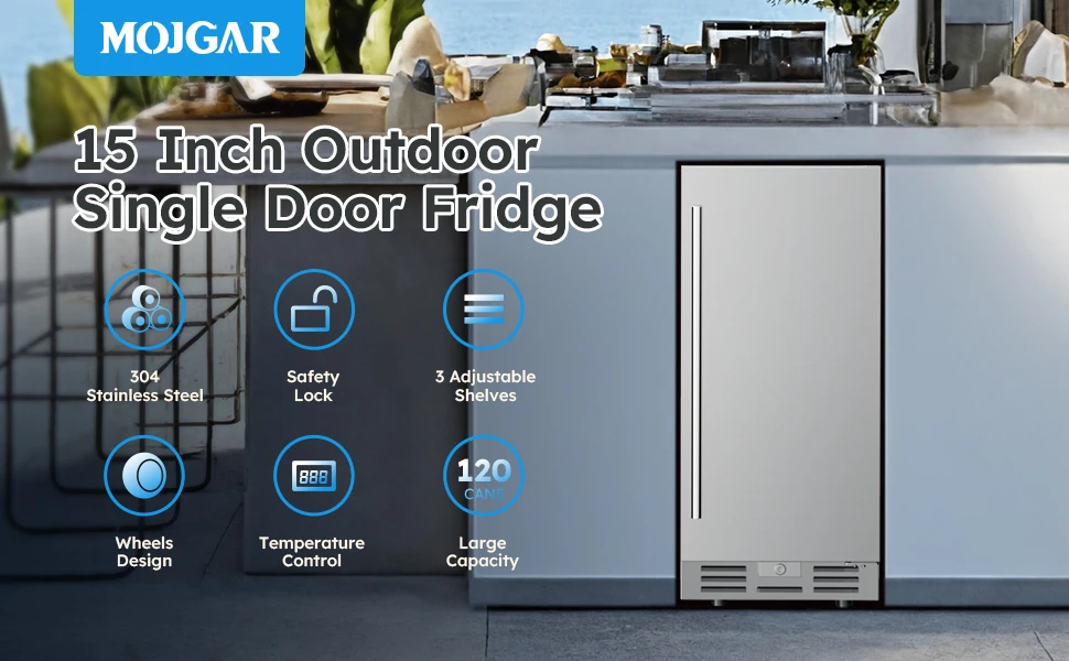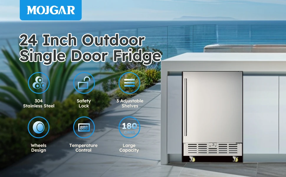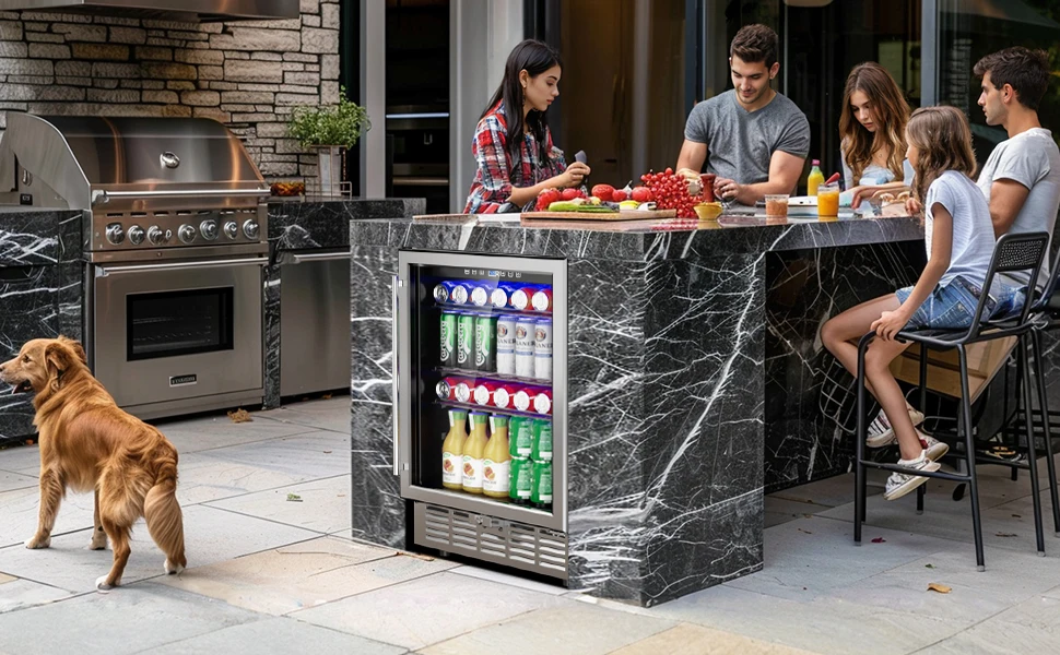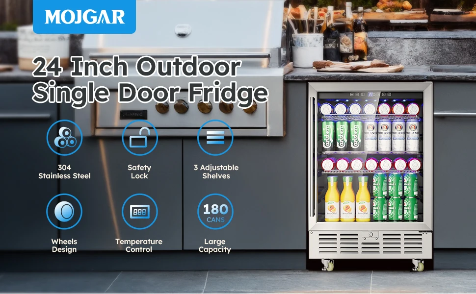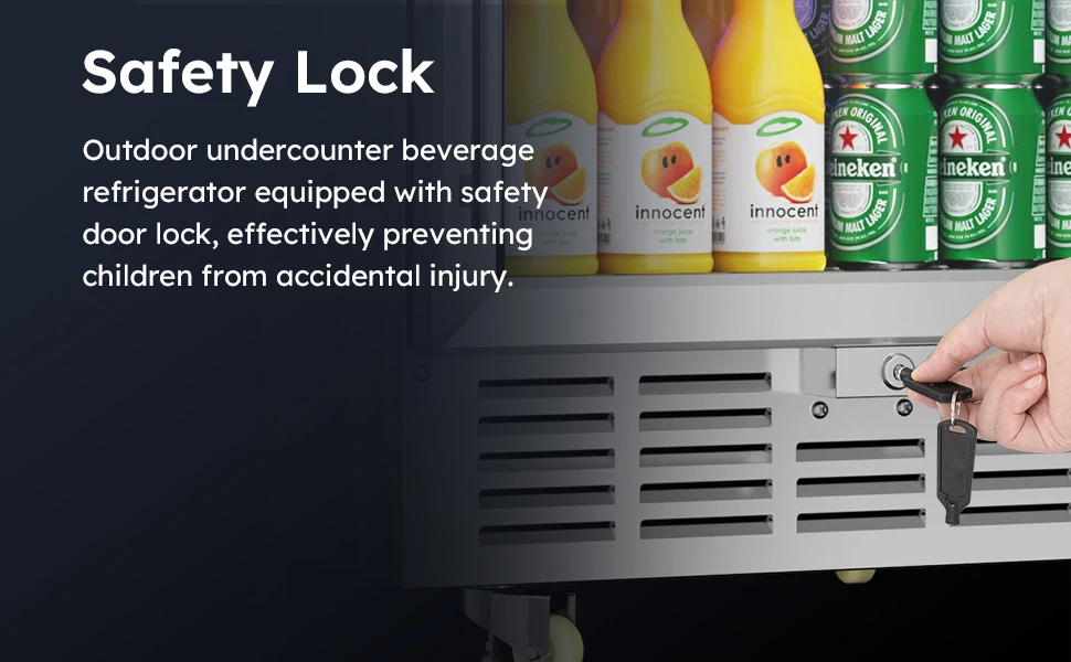 【Outdoor Rated Stainless Steel Refrigerator & Safety Design】- The beverage fridge housing boasts outdoor-rated 304 stainless steel construction. Its structure uses microcellular high-pressure one-piece foaming technology to effectively minimize temperature fluctuations, suitable for indoor/outdoor, commercial and home use.