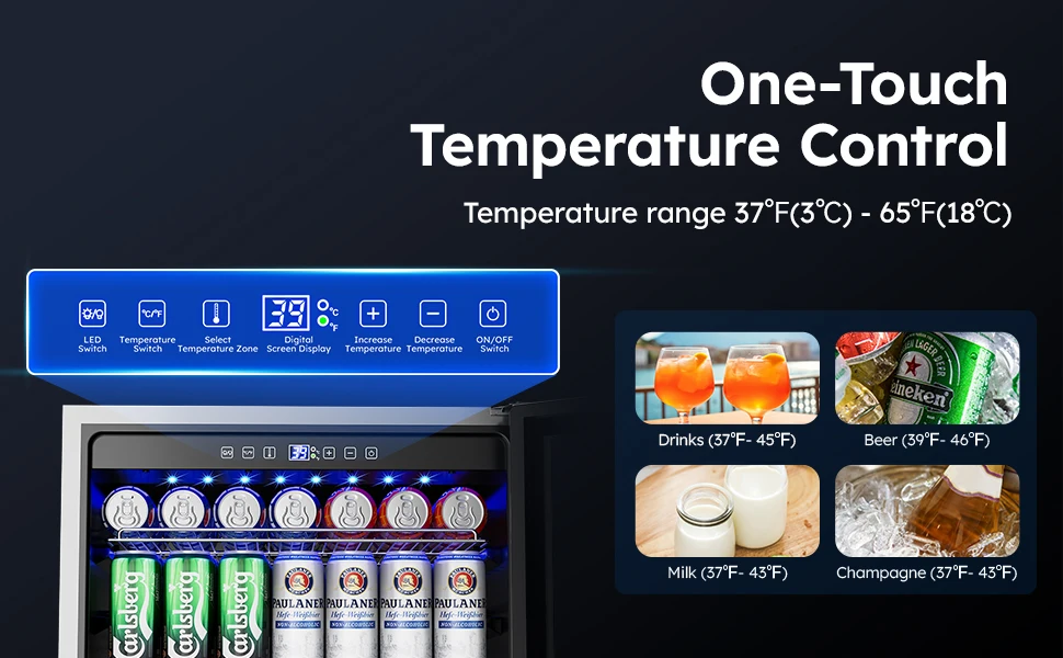 【Smart Temperature Memory& Large Capacity Beverage Fridge】- Under counter beverage refrigerator, if a power failure occurs, can be restored to your last set temperature history when restarted.