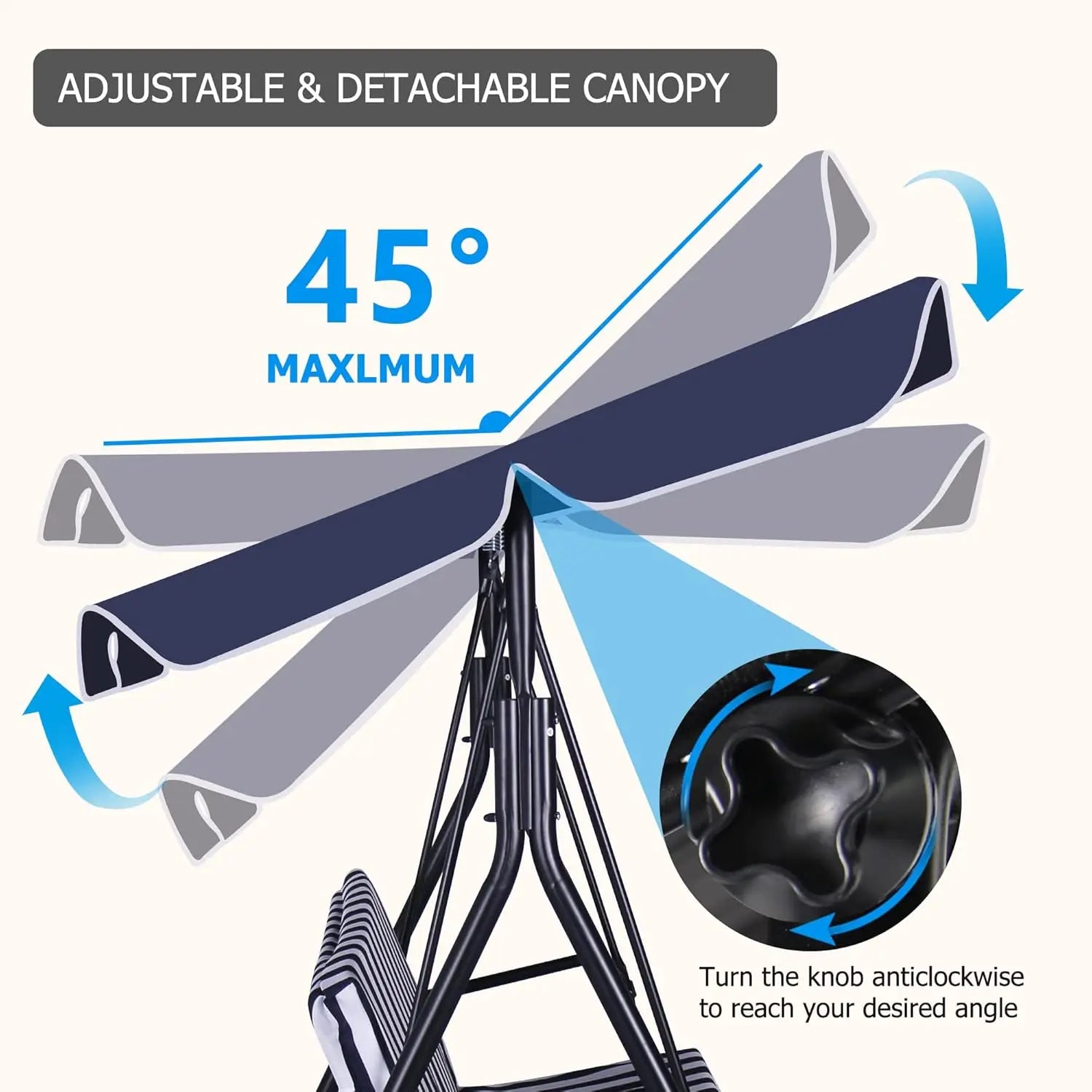 2. 👪ADJUSTABLE CANOPY: Our outdoor porch swing with adjustable canopy comes with durable steel frame. The adjustable canopy can be set at various angles to provide optimal shade. The swing canopy fabric is made of durable, weather-resistant polyester for lasting outdoor use, but it is not recommended that you stay for a long time on rainy days