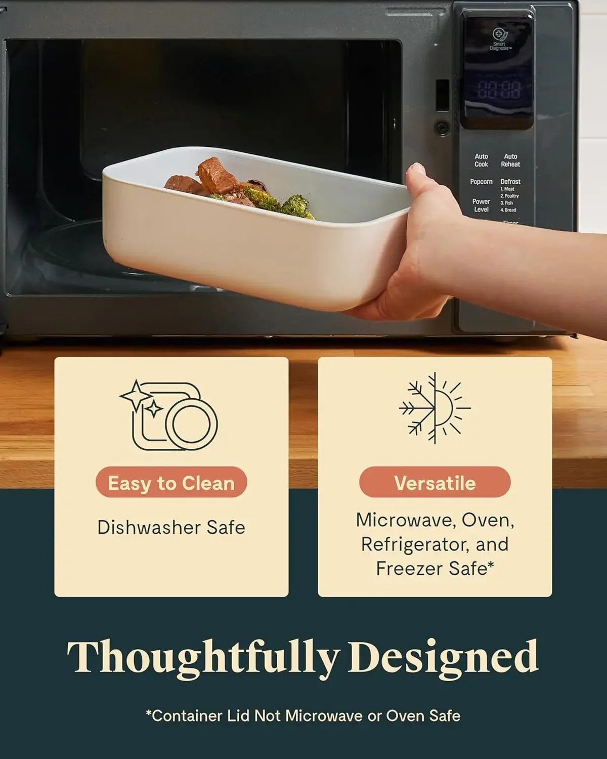 - SAFE, NON-TOXIC CONTAINERS: Our proprietary food container is free of toxic materials such as PTFE, PFOA, PFAS, and BPA. The container is safe for microwave, oven, refrigerator, and freezer use. Lids, Dots, & Dashes are not microwave safe.