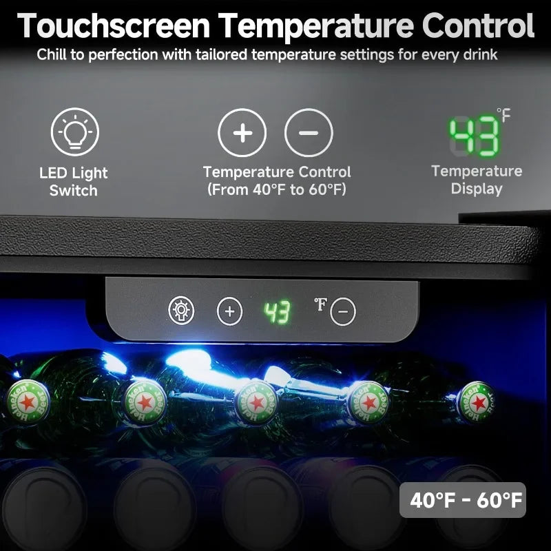 - Precision Touchscreen Temperature Control - Offering a wide temperature range (40°F to 61°F), this glass door mini fridge caters to your diverse storage needs. The intuitive digital display allows for precise temperature control. Keep your drinks at their ideal temperature, ready to serve at a moment's notice.