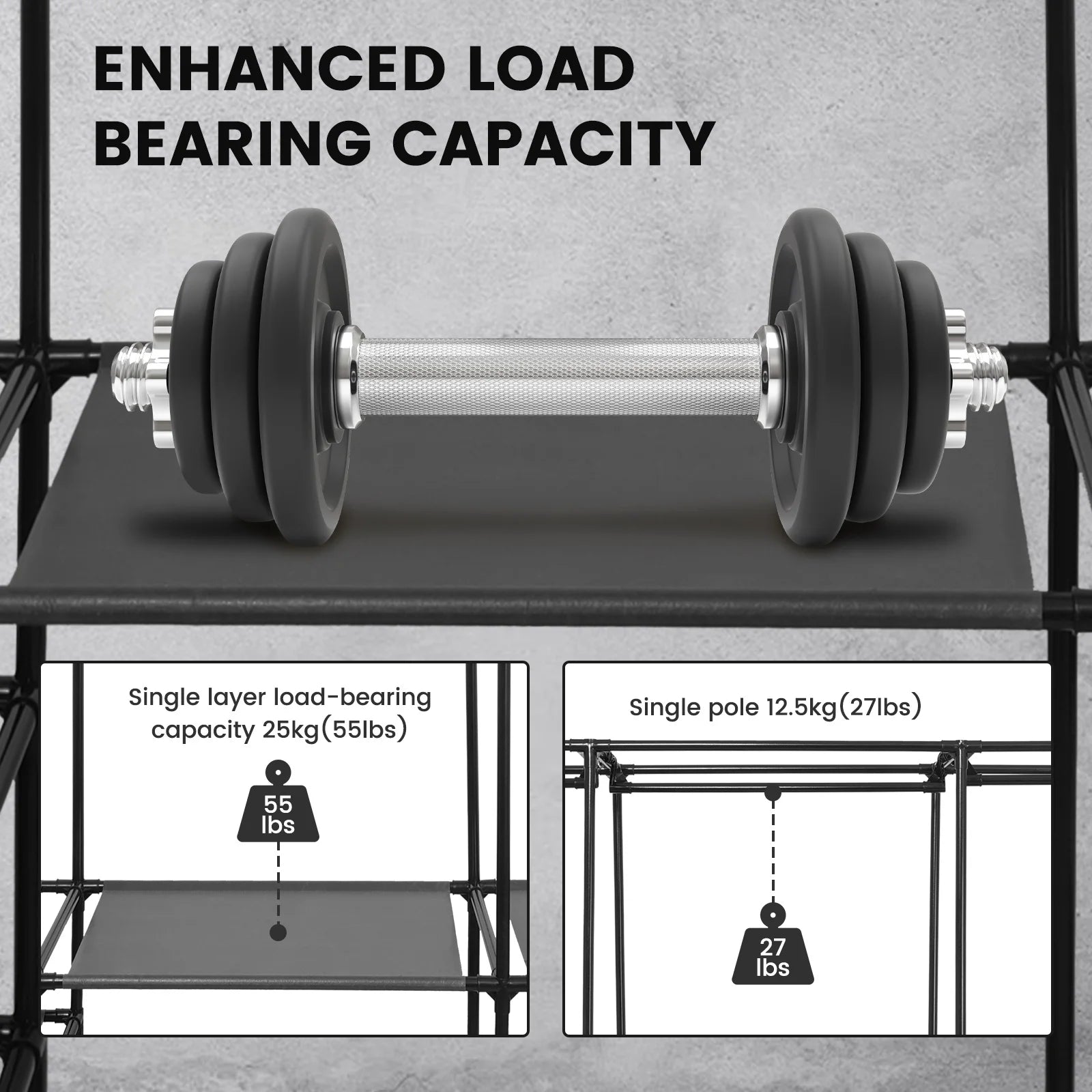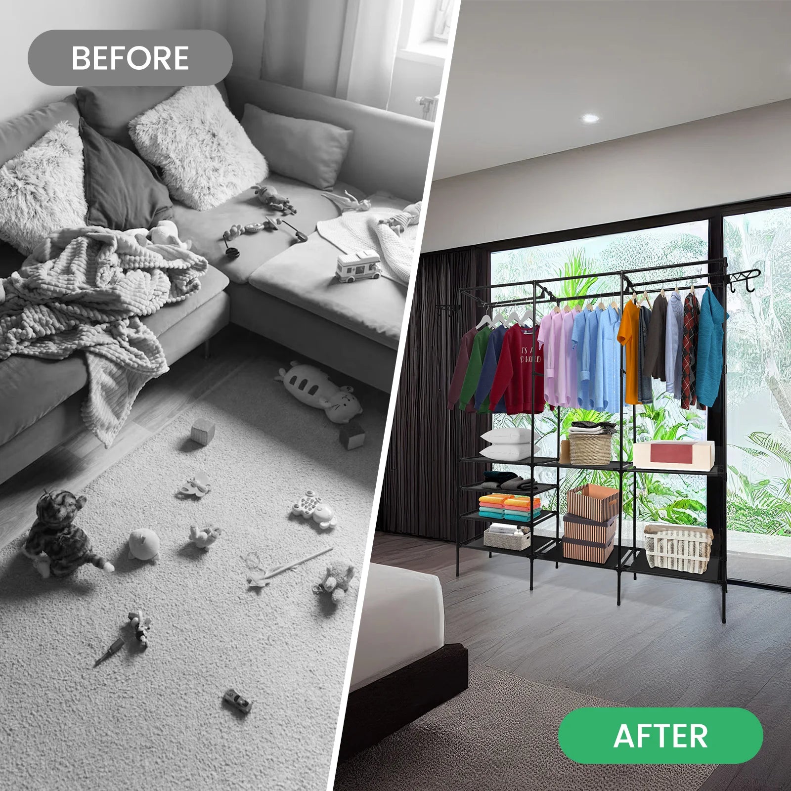[PLENTY STORAGE SPACE] - Extra large clothes closet rack with 2 clothes rails, it can hang coats, long dresses, jackets, and other heavy clothes. The underlying is equipped with multilayer shelving to add extra space to store bedding, shoes, and boxes.