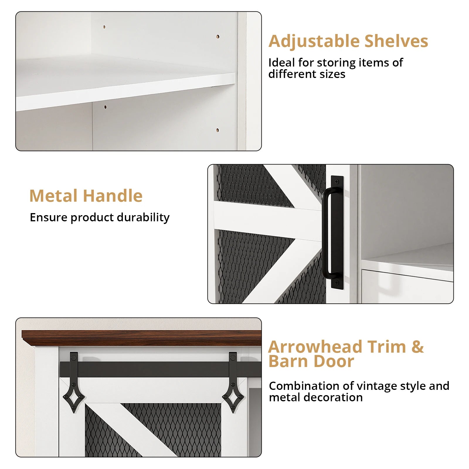 【SimpleandVintage Design】The TV stand's tabletop is designed with a brown premium textured pattern, and the simple frame, metal arrowhead accents, and distinctive barn door design elements are perfect for rustic, industrial, or vintage style home décor.