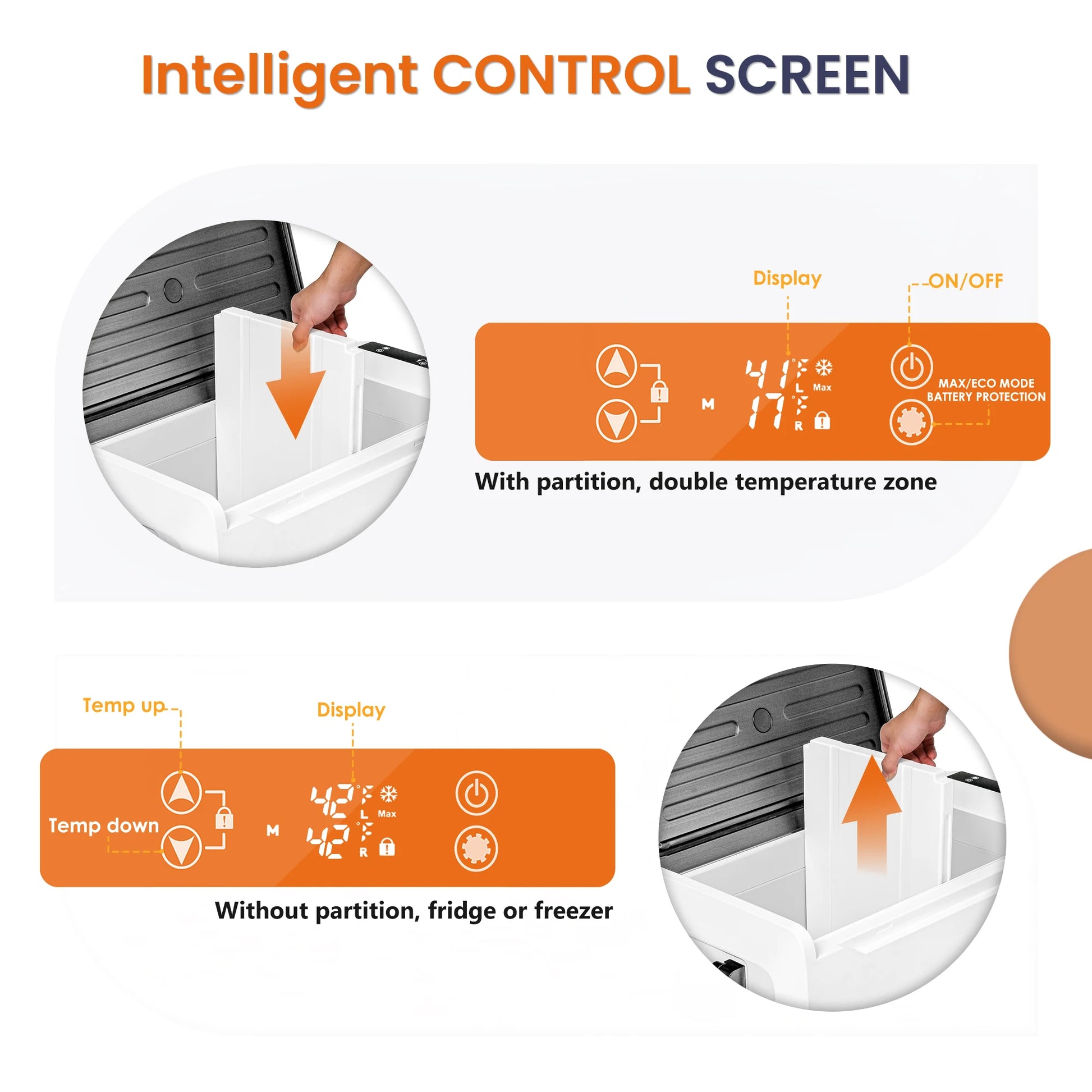 Versatile Storage Solutions:Explore the adaptability of our 12V car fridge with dual zone design and removable divider, catering to your diverse storage needs. Seamlessly switch between cooling and freezing sections, maintaining freshness with customizable temperature settings. Transform into a spacious unit by removing the divider, accommodating all your cooling essentials effortlessly.