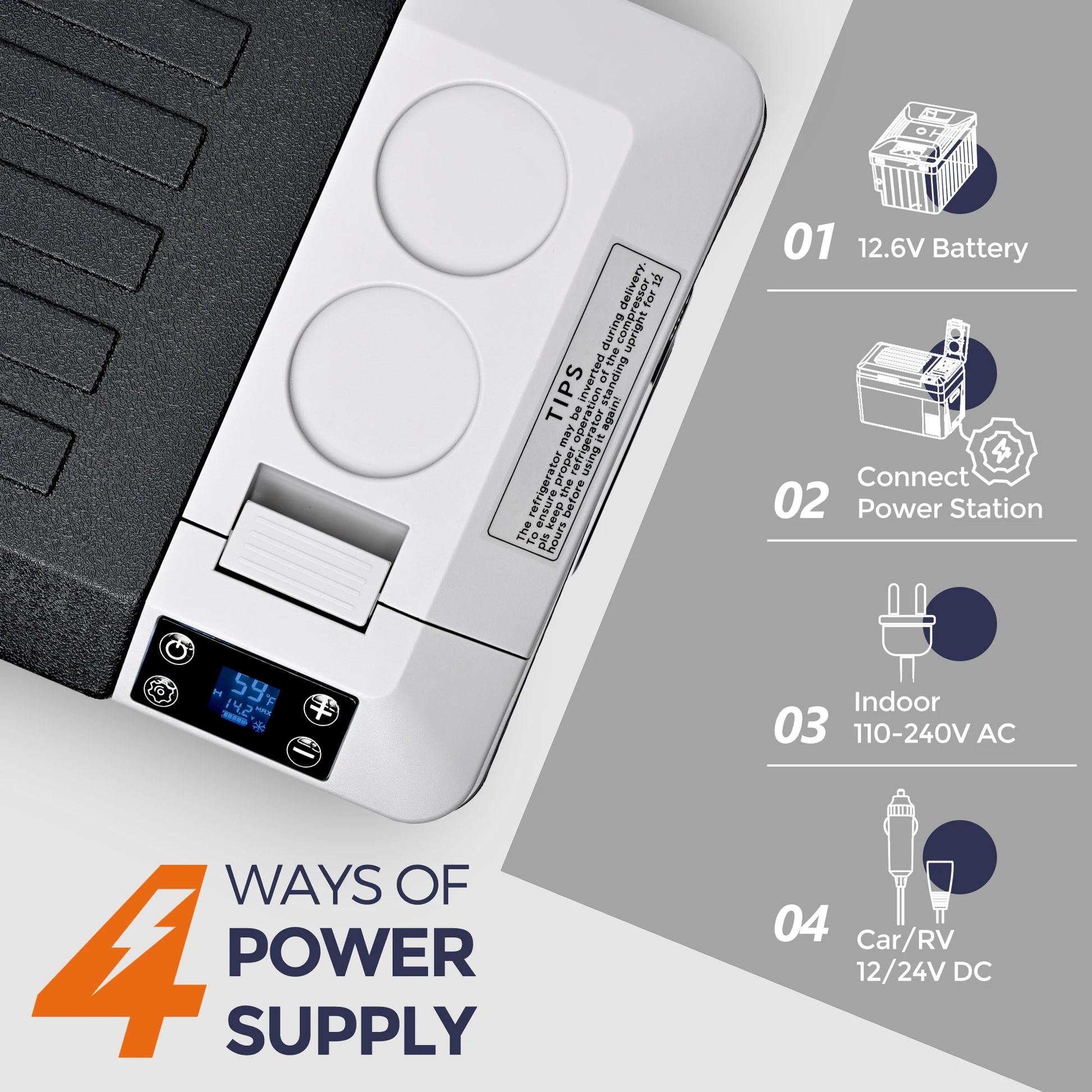 Reliable Battery Protection & Power Options: Equipped with temperature memory and three levels of battery protection, this 12 volt cooler safeguards your car battery from depletion. With multiple power supply modes (12/24V DC and 100-240V AC), this electric cooler adapts to various scenarios seamlessly.
