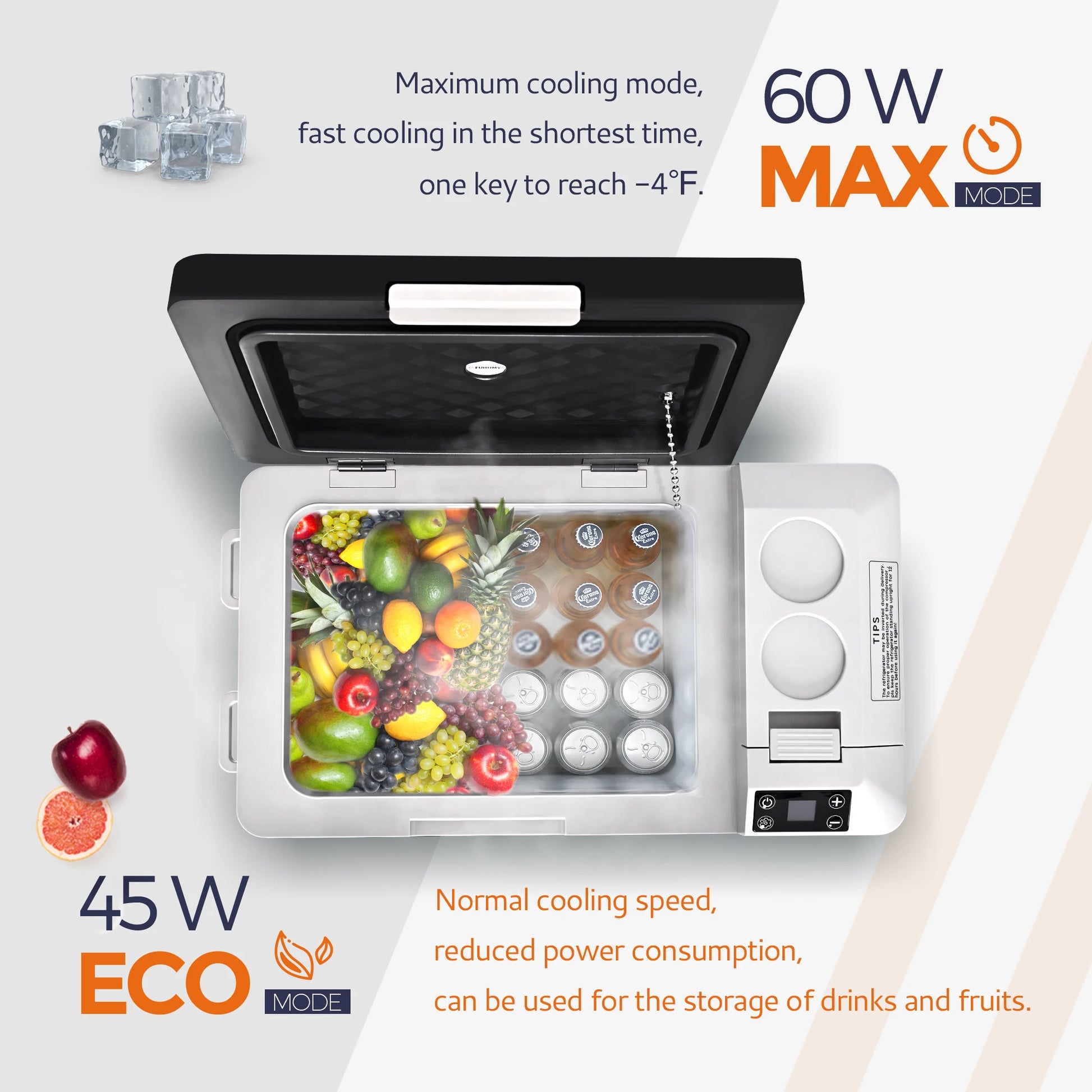 Versatile Cooling Capabilities: Offering a temperature range from -4℉ to 68℉, this car fridge allows for both freezing and storing a variety of foods. Utilizing compressor refrigeration technology, it can rapidly cool from 50℉ to 32℉ within just 15 minutes.