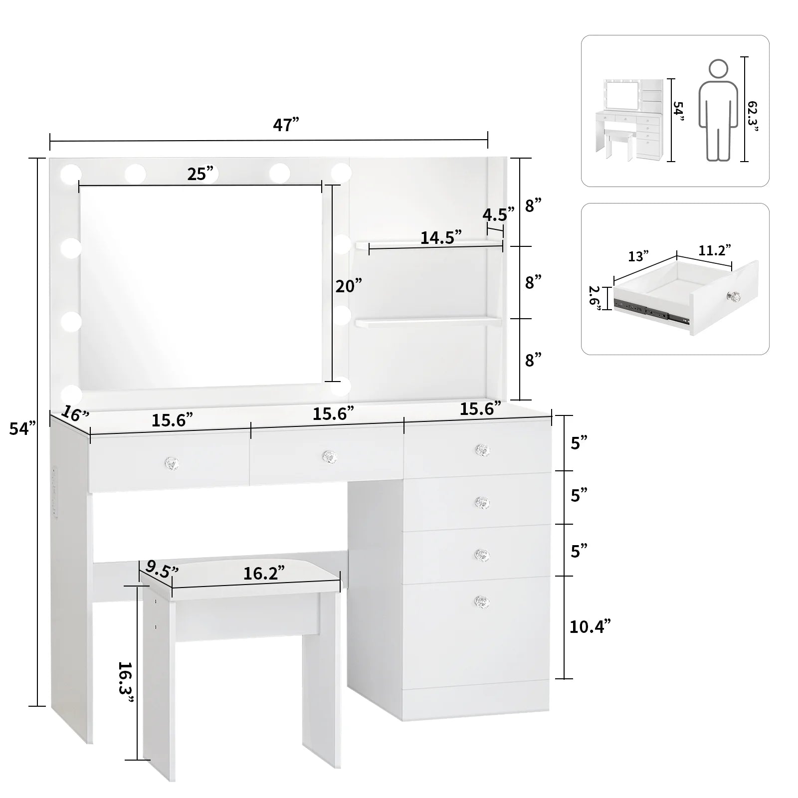 VOWNER Vanity with Lights 47 Inch Makeup Vanity Desk Storage Shelves and 6 Drawers 3 Color Lighting Modes