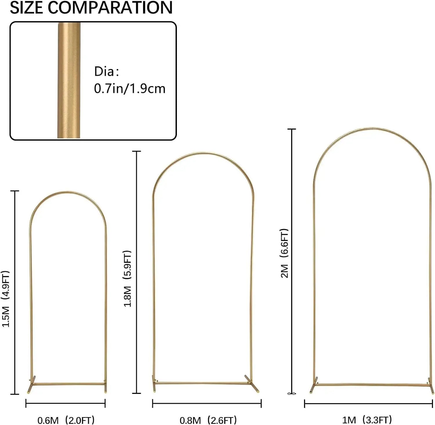 Our metal arch backdrop stand is sold as a combination of three different sizes of metal arches. Three heights of 6.6FT, 5.9FT, and 4.9FT (flowers not included) , Color is light gold, faint gold, (Please allow some color difference with the product itself due to different monitors).
